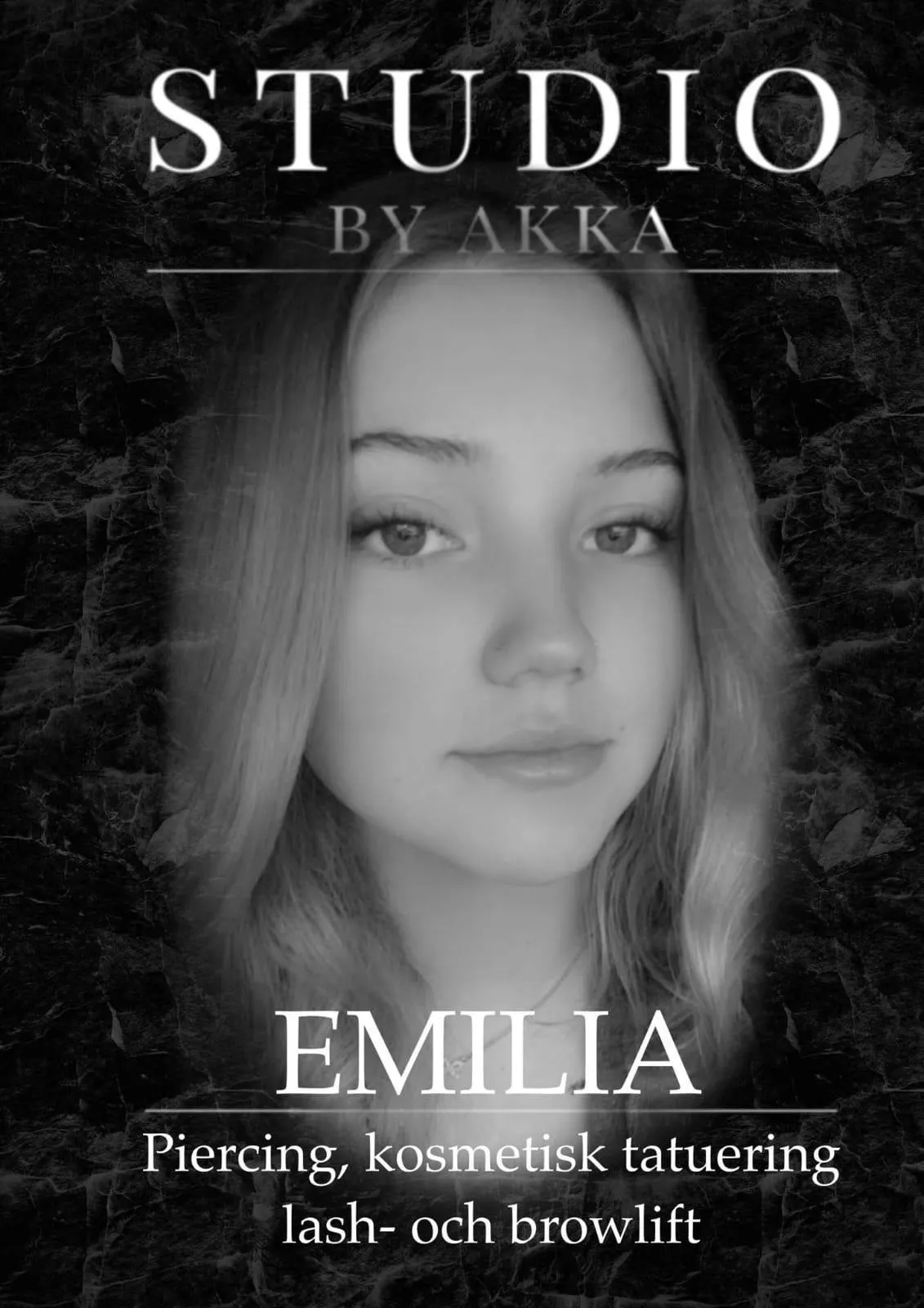 Emilia blev anställd på Studio by Akka i början av 2022. Hon har utbildat sig inom piercing, kosmetisk tatuering och även lash- och brow lift. Trots hennes unga ålder så är hon väldigt duktig och noggrann.